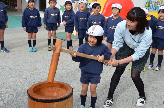 年長さんは先生の力をちょっとの借りて、年中さんは先生の力を借りて、年少さんはお友達と先生の力を借りて杵を持ちました。