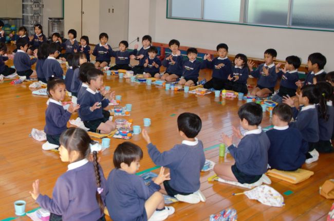 正月遊びをし、お昼は全園児が体育館に集まってカレーライスを食べました。