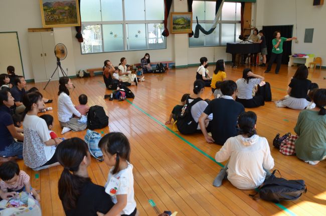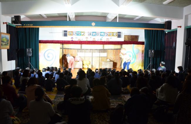 幼稚園の体育館で劇団バクの公演「ねずみのすもう」を見ました。