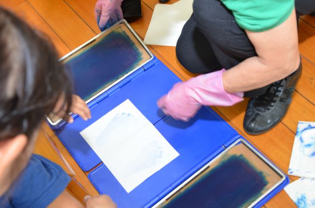 今日のオープンスクールでは親子体操・親子製作のほかに、幼稚園で実際に行っている足型測定をしました。