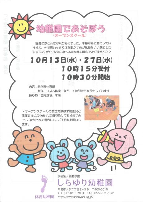 9月22日はオープンスクールを開催します!!新型コロナウイルス感染症の感染拡大防止のため、オープンスクールの参加は事前予約をお願いしております。残りは3組となってます!ご参加お待ちしております。問合せ先:055-253-7081 市村