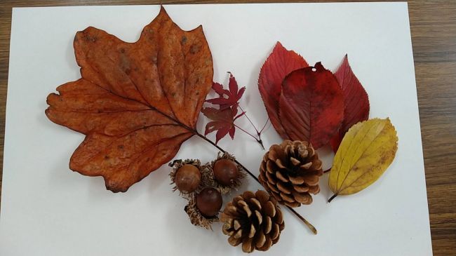 オープンスクールは「秋を探そう!!」として赤色や黄色の葉っぱ松ぼっくりを集めよう!!